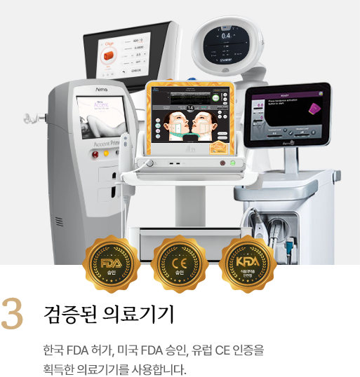 한국 FDA 허가, 미국 FDA 승인, 유럽 CE 인증을획득한 의료기기를 사용합니다.