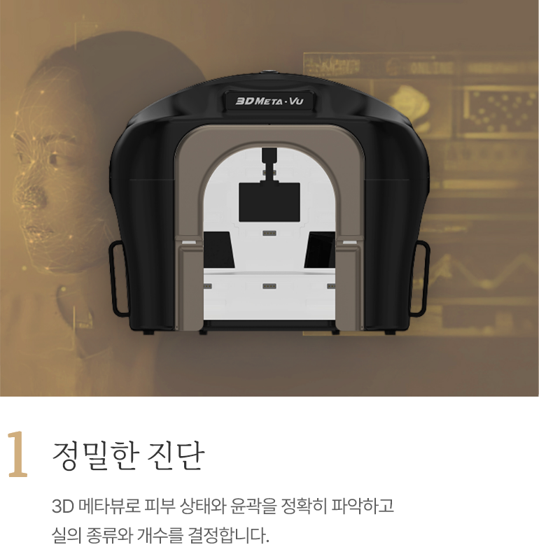 3D 메타뷰로 피부 상태와 윤곽을 정확히 파악하고실의 종류와 개수를 결정합니다.